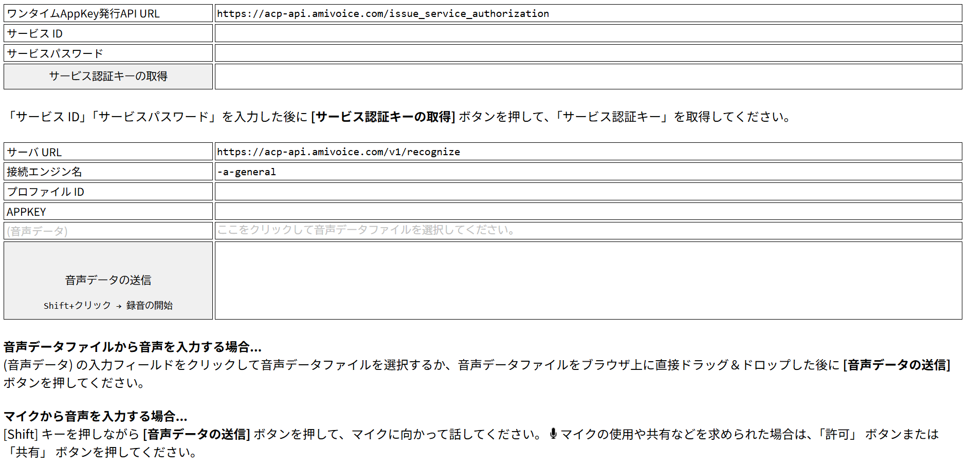 APPKEYdisplayed on MyPage. - Click the [音声データの送信] button.