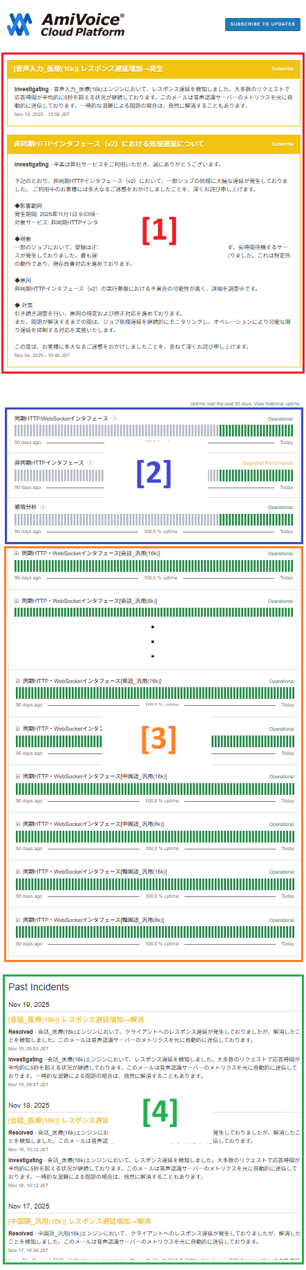 現在発生しているインシデントの情報を掲載しています。ニュース(https://acp.amivoice.com/news/)に掲載している障害情報と同様の内容のほか、エンジンごとの詳細情報のパフォーマンスの低下についても掲載されます。前者については、サービスごとの障害情報にも反映されます。